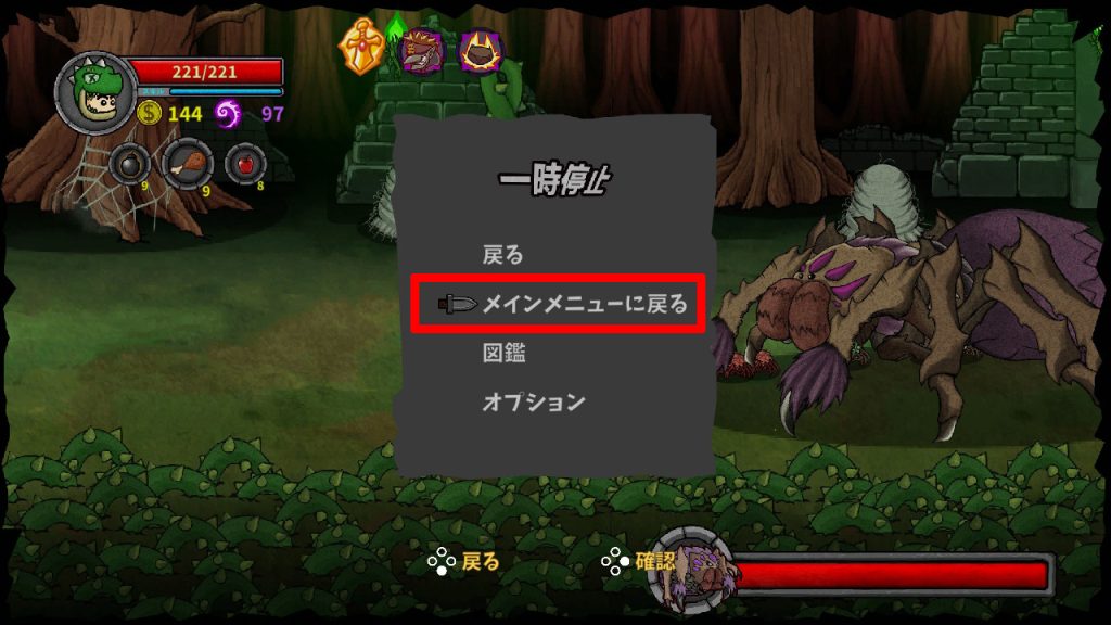 ゲーム中、難所が訪れたらメニュー画面から『メインメニューに戻る』を選択します。