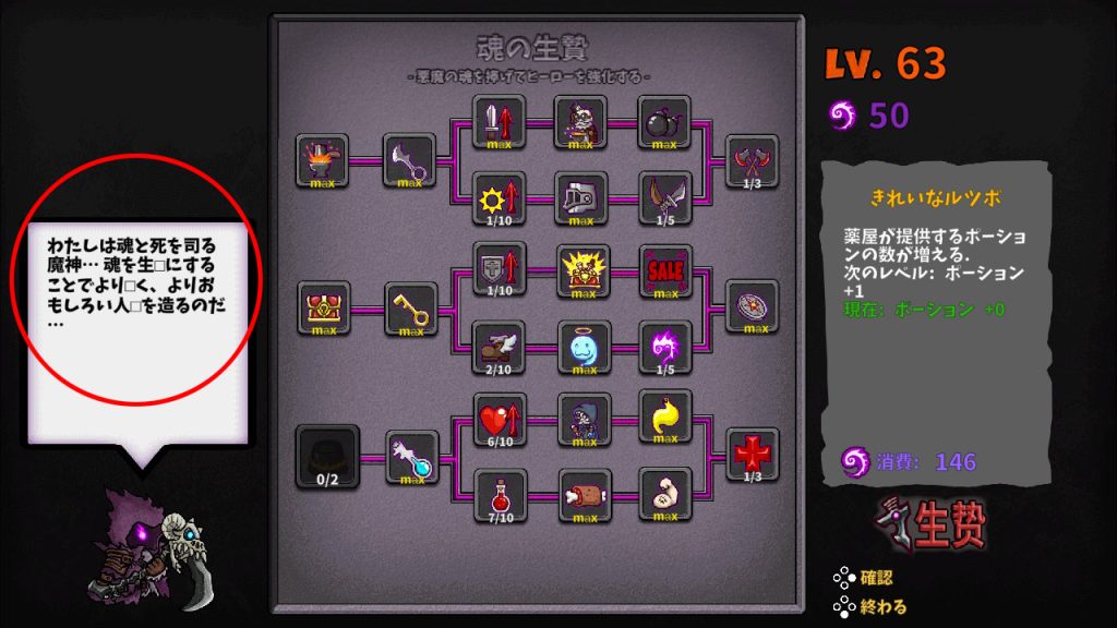スキルツリーシステムもあり、敵を倒した時に得られる魂を集め、ゲームオーバー時にスキルを取得してキャラクターを強化出来ます。